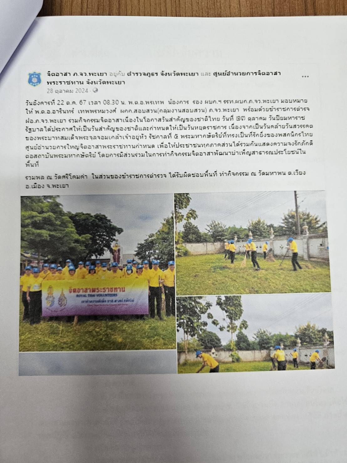 พ.ต.อ.พรเทพ น้องการ รอง ผบก.ฯ รรท.ผบก.ภ.จว.พะเยา มอบหมายให้ พ.ต.อ.อารินทร์ เทพพรหมวงศ์ ผกก.สอบสวน(กลุ่มงานสอบสวน) ภ.จว.พะเยา พร้อมด้วยข้าราชการตำรจ ฝอ.ภ.จว.พะเยา ร่วมกิจกรรมจิตอาสาเนื่องในโอกาสวันสำคัญของชาติไทย วันที่ ๒๓ ตุลาคม วันปิยมหาราช รัฐบาลได้ประกาศให้เป็นวันสำคัญของชาติและกำหนดให้เป็นวันหยุดราชการ เนื่องจากเป็นวันคล้ายวันสวรรคตของพระบาทสมเด็จพระจุลจอมเกล้าเจ้าอยู่หัว รัชกาลที่ ๕ พระมหากษัตริย์ที่ทรงเป็นที่รักยิ่งของพสกนิกรไทย ศูนย์อำนวยการใหญ่จิตอาสาพระราชทานกำหนด เพื่อให้ประชาชนทุกภาคส่วนได้ร่วมกันแสดงความจงรักภักดีต่อสถาบันพระมหากษัตริย์ โดยการมีส่วนร่วมในการทำกิจกรรมจิตอาสาพัฒนาบำเพ็ญสาธารณประโยชน์ในพื้นที่ รวมพล ณ วัดศรีโคมคำ ในส่วนของข้าราชการตำรวจ ได้รับผิดชอบพื้นที่ ทำกิจกรรม ณ วัดมหาพน ต.เวียง อ.เมือง จ.พะเยา