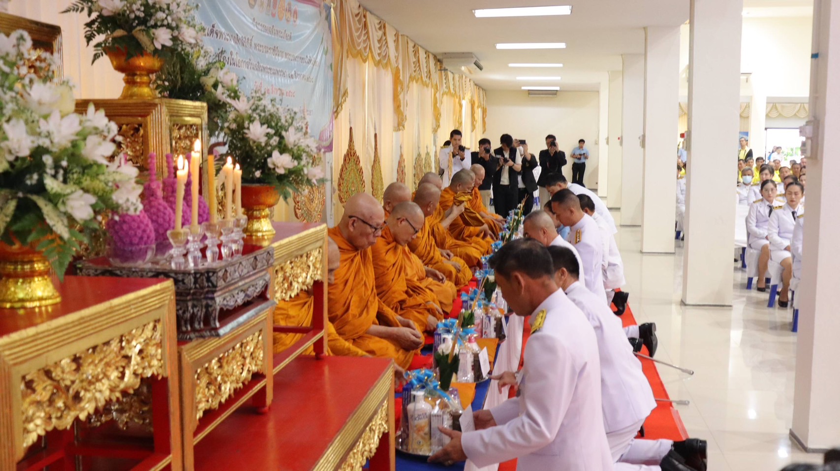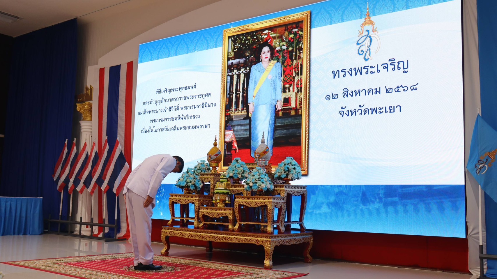 พล.ต.ต.พงษ์สวัสดิ์ ไชยบาล ผบก.ภ.จว.พะเยา มอบหมายให้ พ.ต.อ.อานันท์จักร์ กนกนพวัชร์ รอง ผบก.ภ.จว.พะเยา, คุณกมลชนก ศรีสมบัติ รองประธานแม่บ้านตำรวจภูธรจังหวัดพะเยา, พ.ต.อ.อารินทร์ เทพพรมวงศ์ ผกก.(สอบสวน) กลุ่มงานสอบสวน ภ.จว.พะเยา, พ.ต.อ.หญิง จริญทิพย์ เทพพรมวงศ์ ผกก.ฝอ.ภ.จว.พะเยา พร้อมด้วยข้าราชการตำรวจในสังกัด เข้าร่วมพิธีเฉลิมพระเกียรติสมเด็จพระนางเจ้าสิริกิติ์ พระบรมราชินีนาถ พระบรมราชชนนีพันปีหลวงเนื่องในโอกาสวันเฉลิมพระชนมพรรษา 12 สิงหาคม 2568 ณ ศาลาประชาคมจังหวัดพะเยา โดยมี นายรัฐพล นราดิศร ผู้ว่าราชการจังหวัดพะเยา เป็นประธานในพิธีฯ